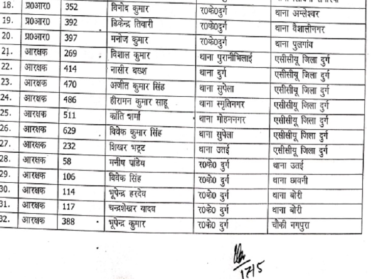 दुर्ग। छत्तीसगढ़ के दुर्ग जिले में पुलिस महकमे में एक बार फिर बड़े पैमाने पर फेरबदल किया गया है। एसएसपी विजय अग्रवाल के निर्देश पर रविवार को 53 पुलिसकर्मियों के ट्रांसफर का आदेश जारी किया गया। तबादला सूची में 1 एएसआई, 9 प्रधान आरक्षक और 33 आरक्षक सहित कुल 53 पुलिसकर्मियों के नाम शामिल हैं। इनमें से 42 को विभिन्न थानों में नई पोस्टिंग दी गई है।