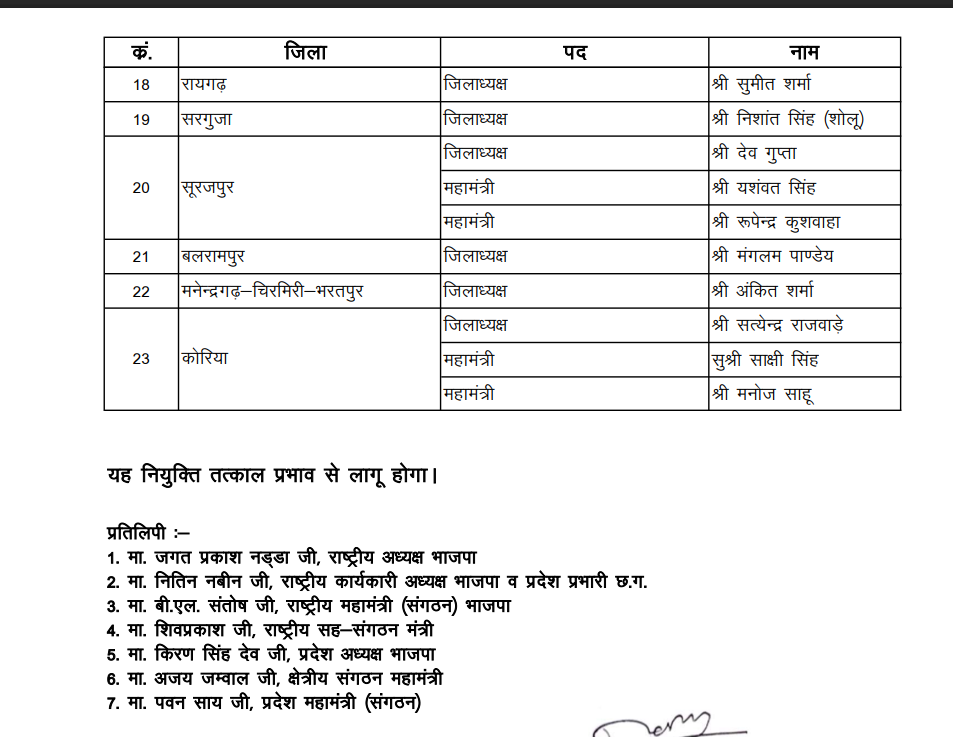 भाजपा संगठन की ओर से जारी आदेश के अनुसार, युवा और महिला नेतृत्व को मजबूत करने के उद्देश्य से कई नए चेहरों को जिम्मेदारी सौंपी गई है। रायपुर ग्रामीण भाजयुमो जिला अध्यक्ष की जिम्मेदारी पिंटू साहू को दी गई है। वहीं रायपुर शहर महिला मोर्चा जिलाध्यक्ष के पद पर कृतिका जैन को नियुक्त किया गया है। पार्टी नेतृत्व ने उम्मीद जताई है कि नए पदाधिकारी संगठन को जमीनी स्तर पर और अधिक मजबूत करेंगे।