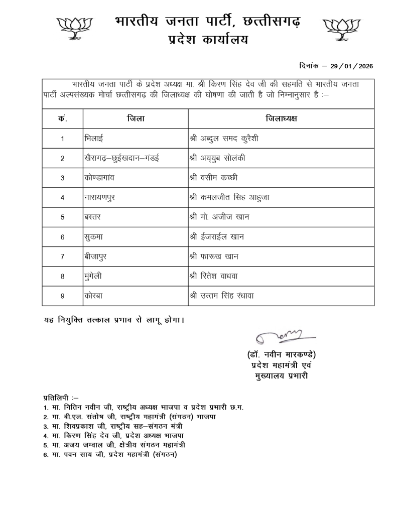 रायपुर। भारतीय जनता पार्टी (भाजपा) ने अपने संगठन में अल्पसंख्यक मोर्चा, अनुसूचित जाति (अजा) मोर्चा और युवा मोर्चा में नए जिला अध्यक्ष और महामंत्रियों की नियुक्तियां की हैं। यह नियुक्तियां प्रदेश अध्यक्ष किरण सिंह देव की सहमति से की गई हैं और तत्काल प्रभाव से लागू हो गई हैं।