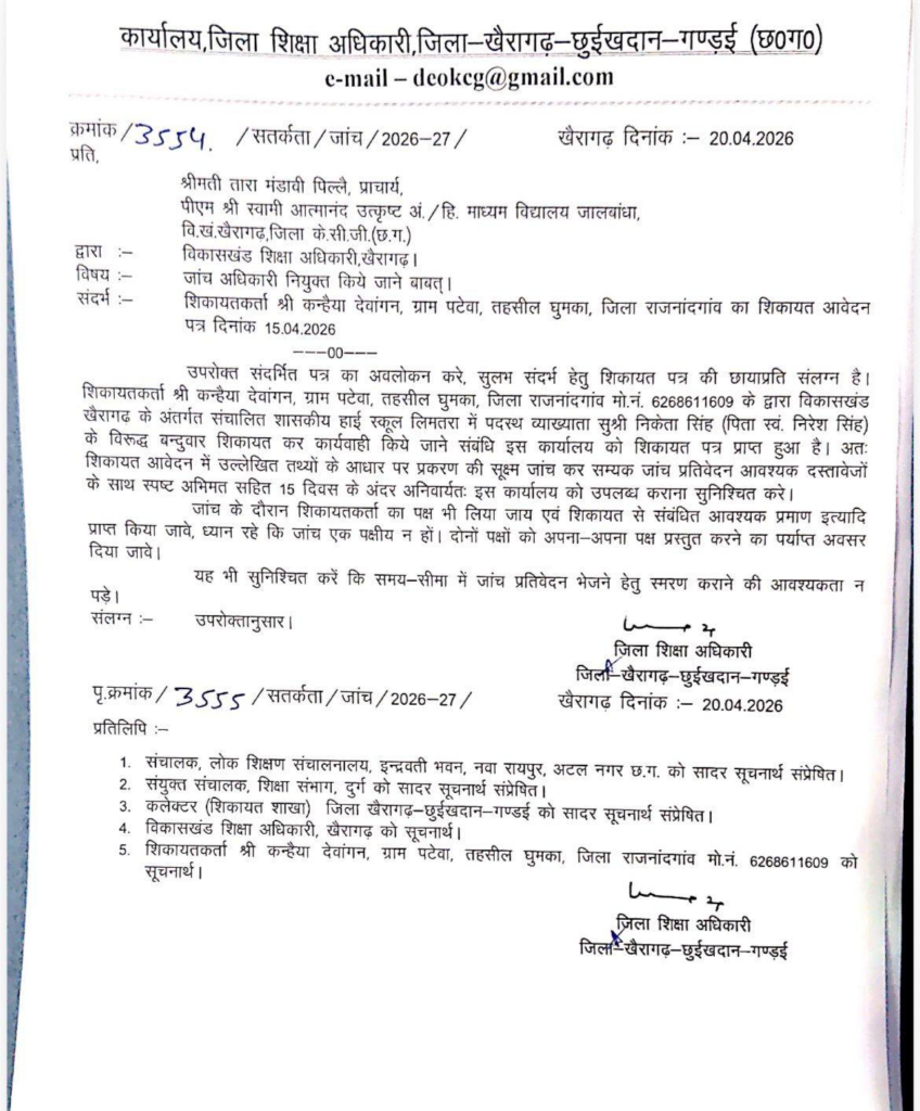 जिला शिक्षा अधिकारी ने 20 अप्रैल 2026 को मामले की जांच के आदेश दिए हैं। प्राचार्य को जांच सौंपी गई है और 15 दिनों में रिपोर्ट मांगी गई है। अब जांच रिपोर्ट पर सभी की नजरें टिकी हैं।
