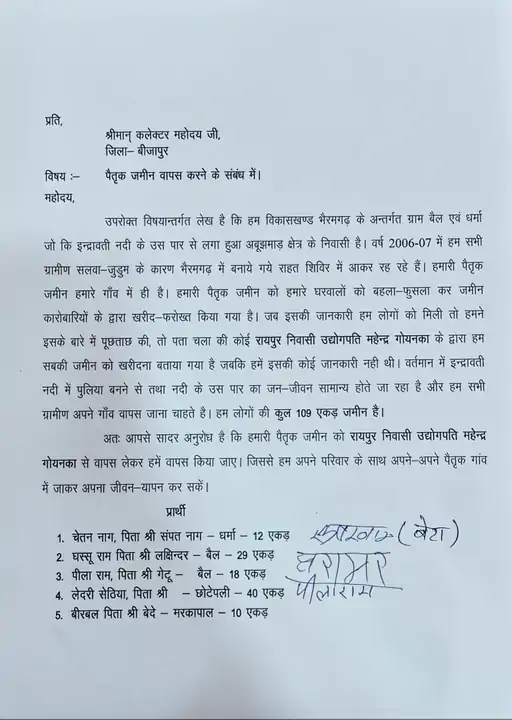 मंडावी ने प्रेसवार्ता में बताया कि भैरमगढ़ राहत शिविरों में रह रहे इन विस्थापित परिवारों को जमीन बिक्री की कोई जानकारी नहीं थी। बावजूद इसके, उद्योगपति ने फर्जी दस्तावेजों के माध्यम से जमीन अपने नाम दर्ज करा ली। उन्होंने कहा कि इस मामले में तत्काल जांच कर जमीनें मूल मालिकों को लौटाई जानी चाहिए।