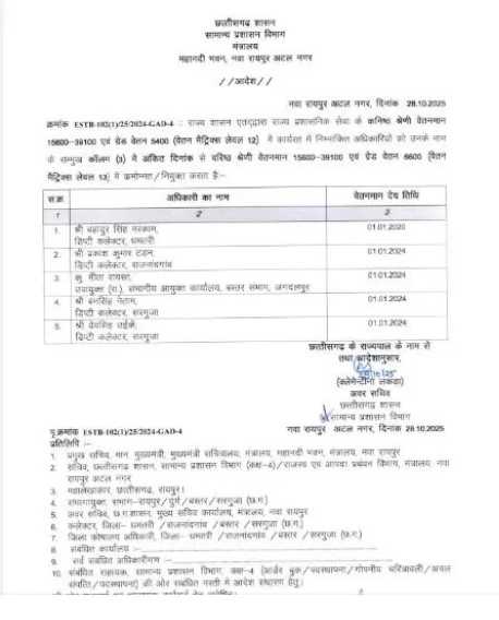 सरकार की ओर से जारी आदेश के मुताबिक, इन अधिकारियों को उनकी सेवा अवधि और कार्य प्रदर्शन के आधार पर वरिष्ठ श्रेणी में पदोन्नति दी गई है। इससे उन्हें न केवल वेतनमान में बढ़ोतरी का लाभ मिलेगा, बल्कि प्रशासनिक जिम्मेदारियों में भी नई भूमिका निभाने का अवसर मिलेगा।